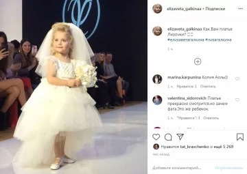 "Навіщо діток одягати у весільні сукні??? Що, інших нема???", "Плаття гарне, але Лізочка просто принцеса!❤️", "Красуня, плаття ніщо порівняно з Лизочкою🤗", "👗 супер,а Лізочка ❤️ краще будь-якого плаття!!!!!Красунечка, спокусниця маленька😍😮😍😮😍😮😮😍😮", "Лізочка, красуня ❤❤😘😘😘🌹🌹", "Плаття прекрасно виглядає,але навіщо фата.Це ж дитина", Принцеса !! Ліза, дуже гарненька !!👍😍", "Ліза красуня! На маму схожа", "Янголятко гарна Лізонька!!!!!👏👏👏", "Янгольське дитя", "👍красуня", "Це просто диво👍🤩🍓принцеса!!!", - написали користувачі мережі.