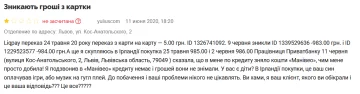 «Liqpay переклад 24 травня 20 року переклад з карти на карту - 5.00 грн. ID 1326741092. 9 червня зникли ID 1339529636 -983.00 грн. ID 1229523577 -984.00 грн. Ще я роблю покупки в Ірландії: покупка 25 травня 985.00 і 2 червня 986.00. Працівниця Приватбанку 11 червня (вулиця Кос-Анатольського, 2, Львів, Львівська область, 79049) сказала, що у мене за кредитом зняло засоби «Манівео», чим мене просто добила!», - обурився українець.