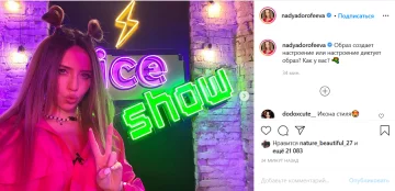 На фото Дорофєєва позує на тлі стіни, прикрашеної неоновими вивісками і гірляндою з великими лампочками. Образ співачка підібрала під стать такому фону. На ній яскраво-рожева курточка, яку артистка залишила розстебнутою, а також помітний чокер з великими намистинами.